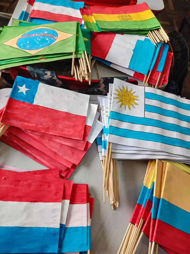 Um mutirão realizado por estudantes, professores e direção da Emeb Professor Osni de Medeiros garantiu que as bandeirinhas ganhassem vida a tempo para o evento. Sob orientação dos professores, os estudantes das turmas dos anos finais do Ensino Fundamental foram os responsáveis pela pintura das bandeirinhas dos países. Já as crianças dos anos iniciais realizaram a pintura que fez referência à campanha Outubro Rosa.