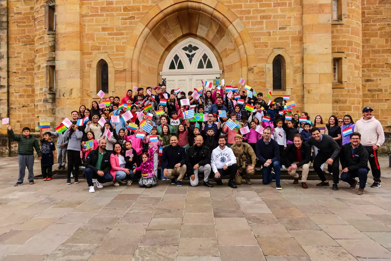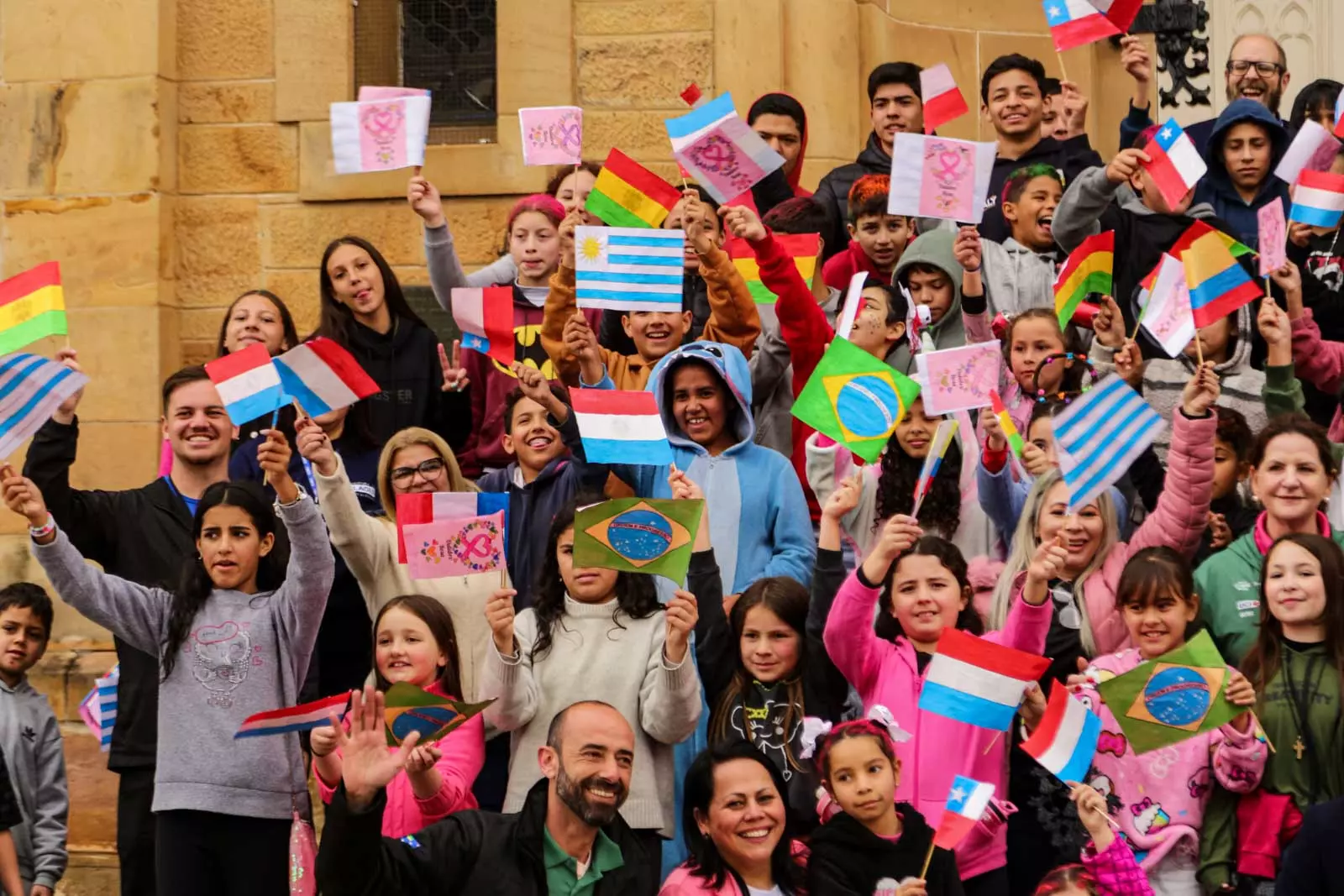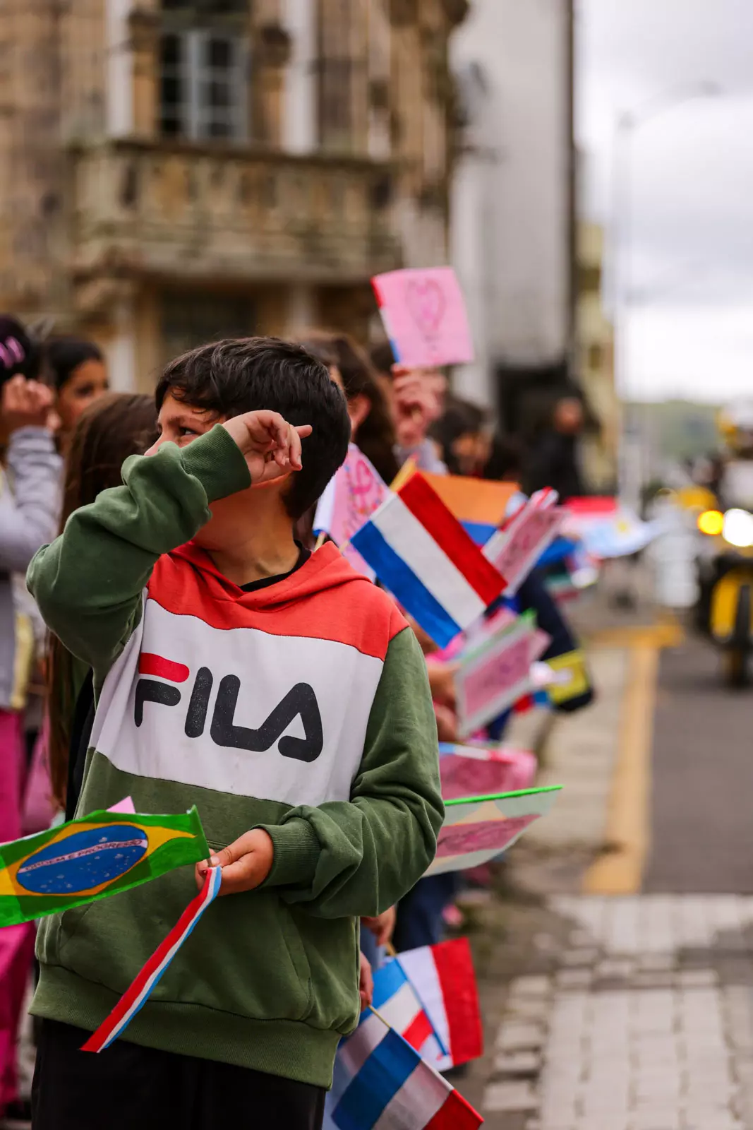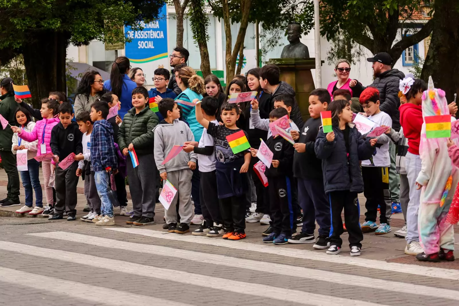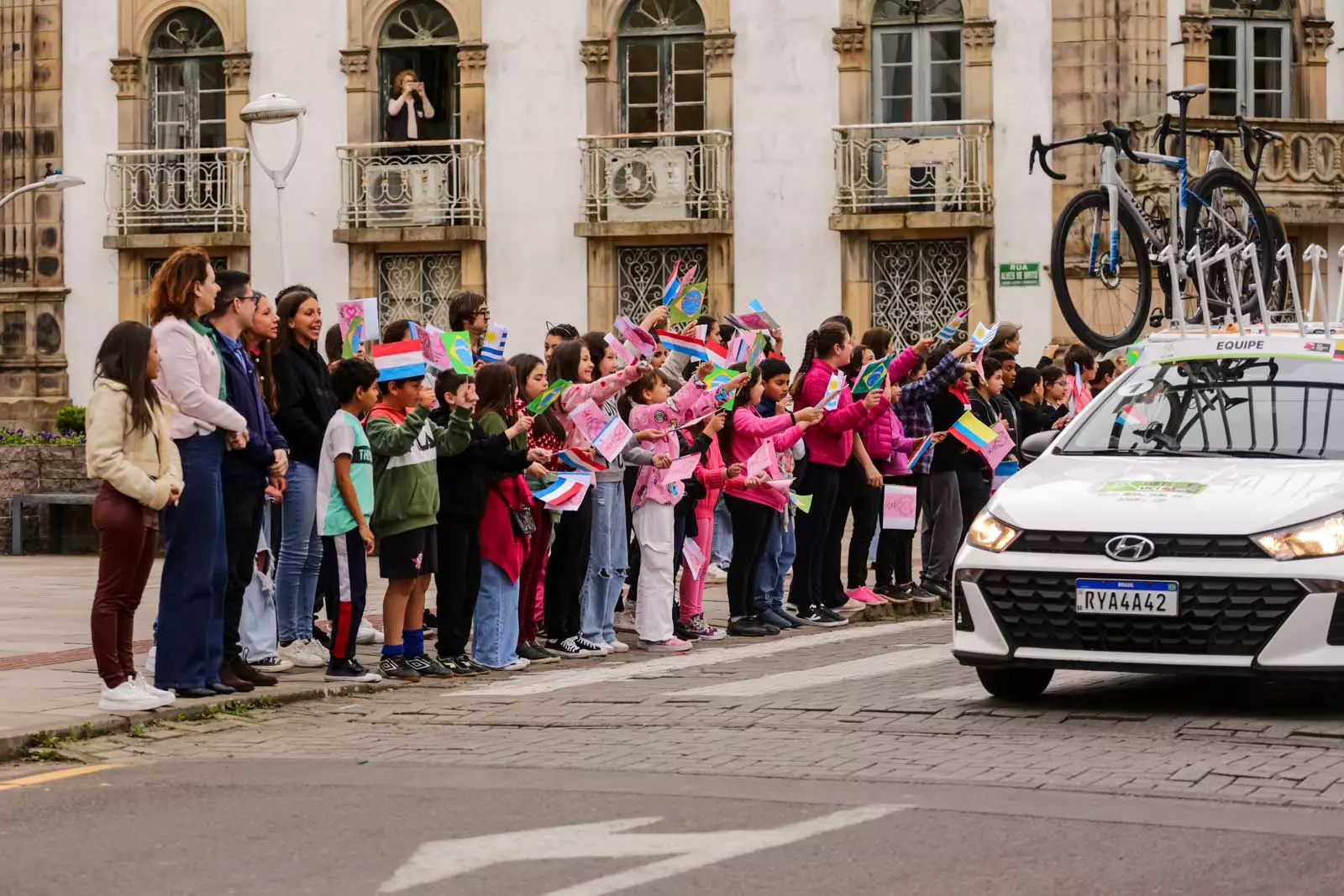 Posicionados em frente à Catedral Diocesana, nos dois lados da rua, os estudantes das Escolas Municipais de Educação Básica (Emebs) Professor Osni de Medeiros Régis, Izidoro Marin e Nossa Senhora da Penha esperavam a passagem dos atletas portando bandeirinhas dos oito países (Brasil, Bolívia, Chile, Colômbia, França, Holanda, Paraguai e Uruguai) que faziam parte da disputa. A cada atleta e equipe de apoio que passava, as bandeirinhas tremulavam e garantiam a alegria geral de todos que prestigiaram a largada.