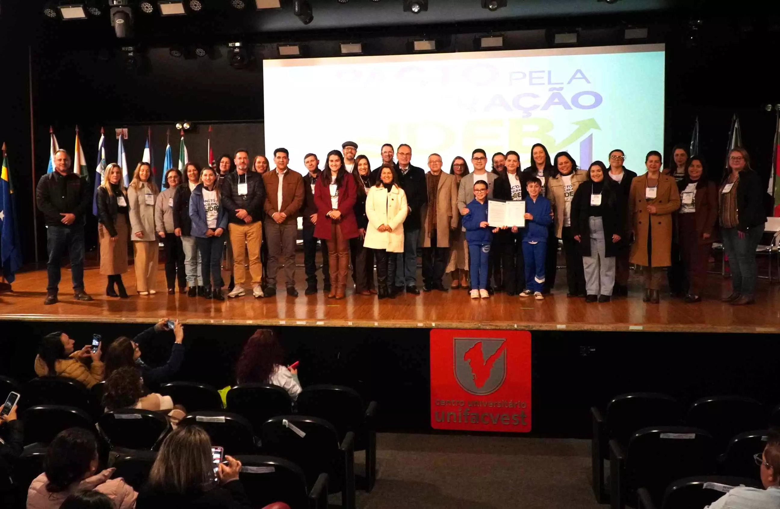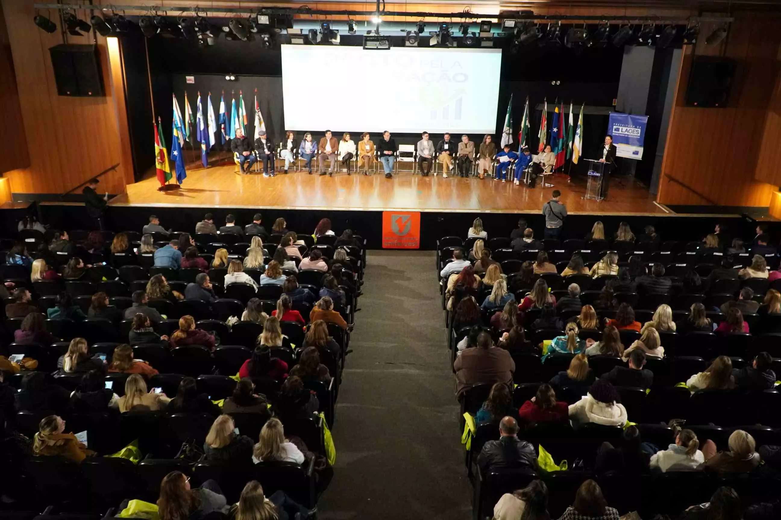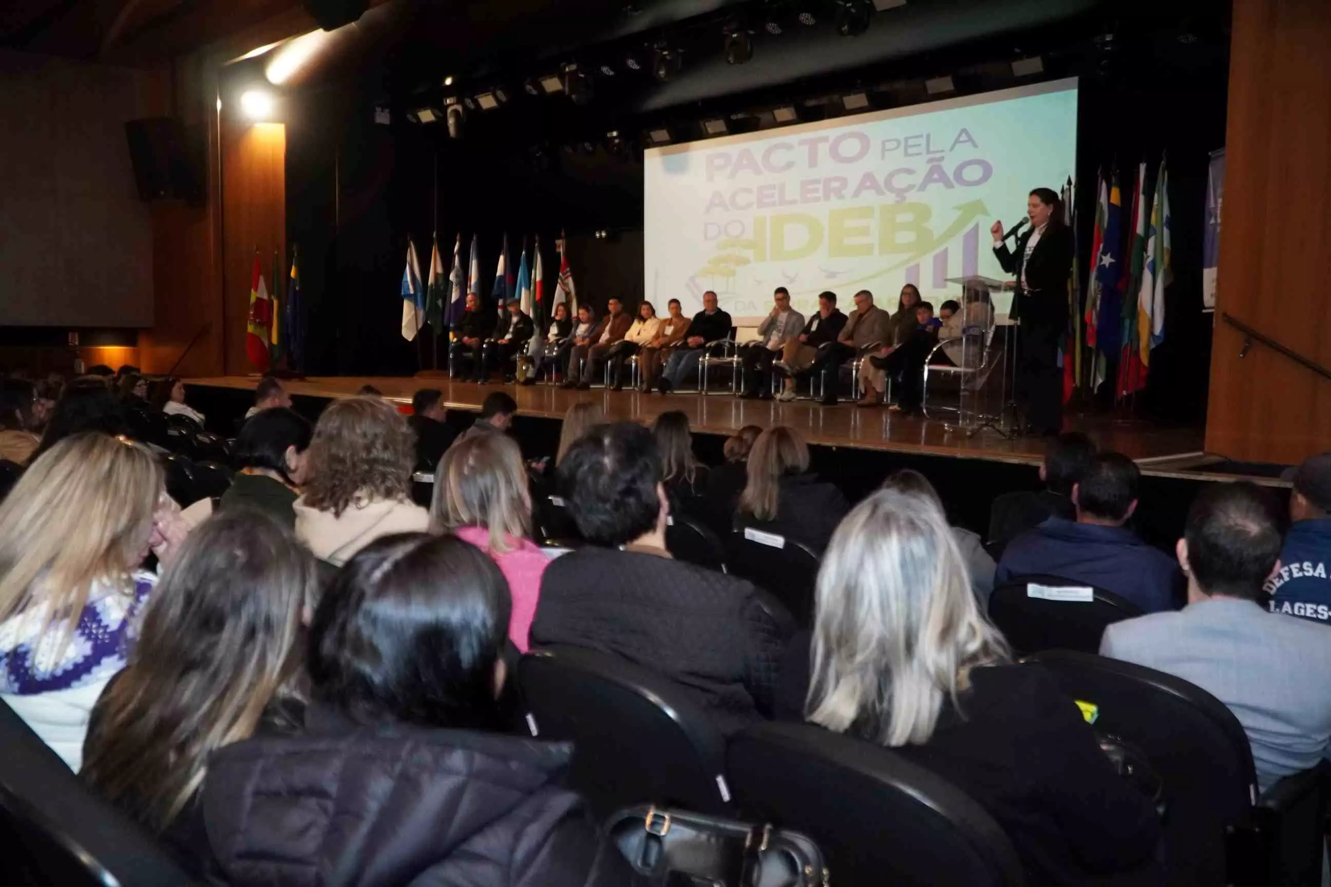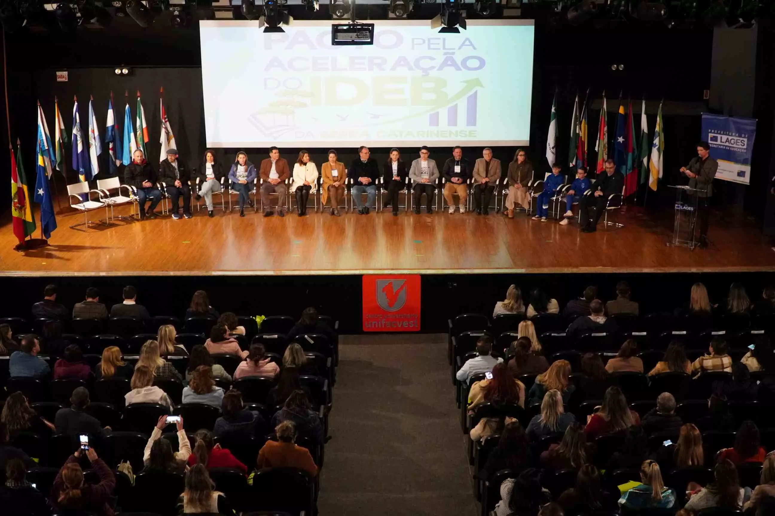 O município de Lages foi anfitrião, nesta terça-feira (26 de agosto), do Pacto pela Aceleração do Índice de Desenvolvimento da Educação Básica (Ideb) da Serra Catarinense. O ato de assinatura do Pacto foi realizado no Teatro do Centro Universitário Facvest (Unifacvest) e contou com a presença de prefeitos e secretários de Educação de cidades pertencentes à Associação dos Municípios da Região Serrana (Amures), entre outras autoridades. Idealizado pela Prefeitura de Lages, por intermédio da Secretaria da Educação, o evento ainda oportunizou a palestra “Aprendizagem com equidade e o direito dos estudantes”, do especialista em Políticas Educacionais e Ideb, professor Carlos Sanches.