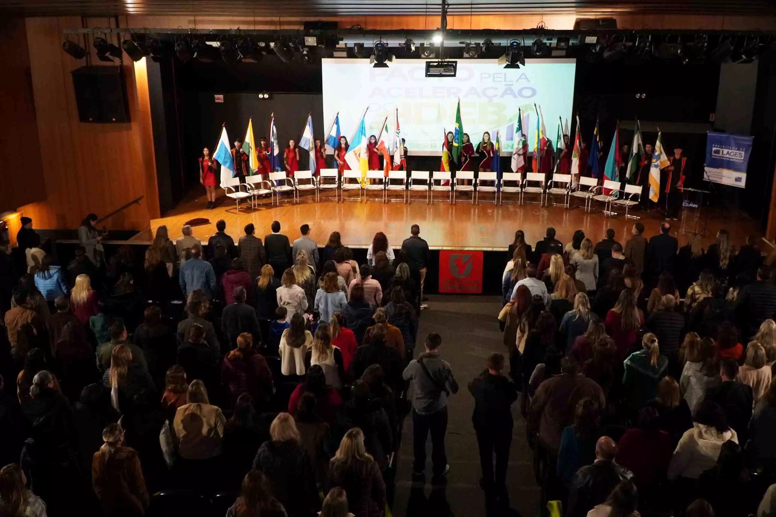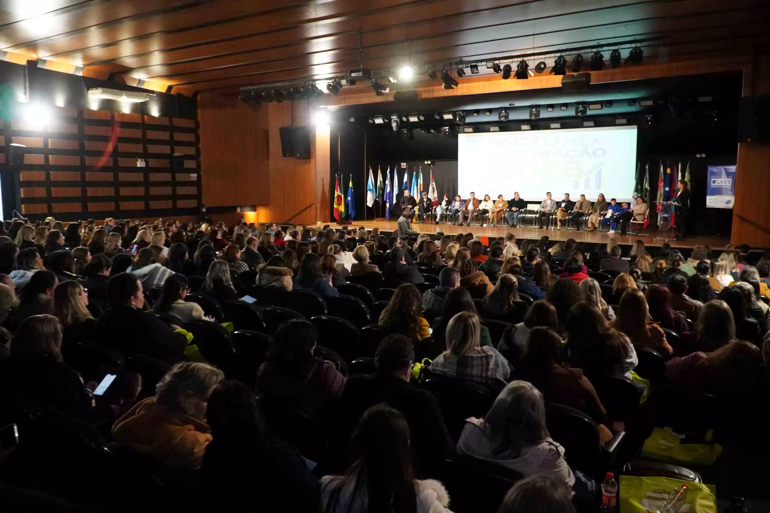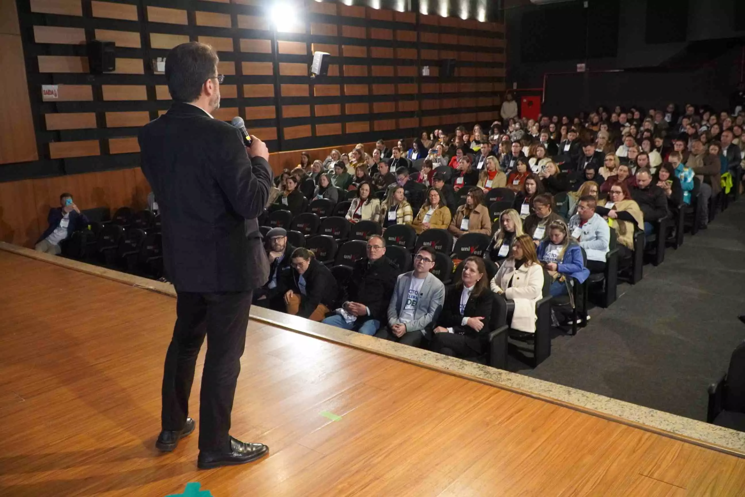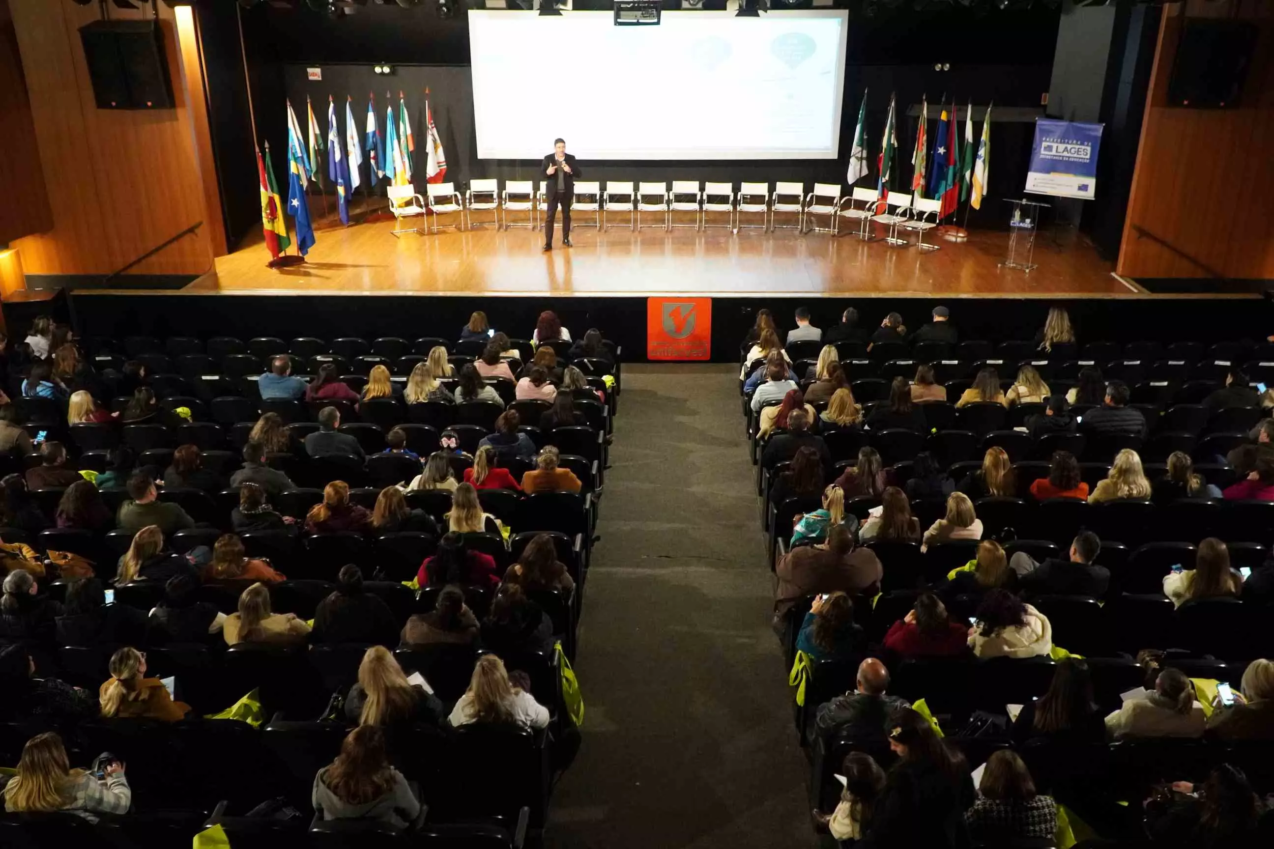 O município de Lages foi anfitrião, nesta terça-feira (26 de agosto), do Pacto pela Aceleração do Índice de Desenvolvimento da Educação Básica (Ideb) da Serra Catarinense. O ato de assinatura do Pacto foi realizado no Teatro do Centro Universitário Facvest (Unifacvest) e contou com a presença de prefeitos e secretários de Educação de cidades pertencentes à Associação dos Municípios da Região Serrana (Amures), entre outras autoridades. Idealizado pela Prefeitura de Lages, por intermédio da Secretaria da Educação, o evento ainda oportunizou a palestra “Aprendizagem com equidade e o direito dos estudantes”, do especialista em Políticas Educacionais e Ideb, professor Carlos Sanches.