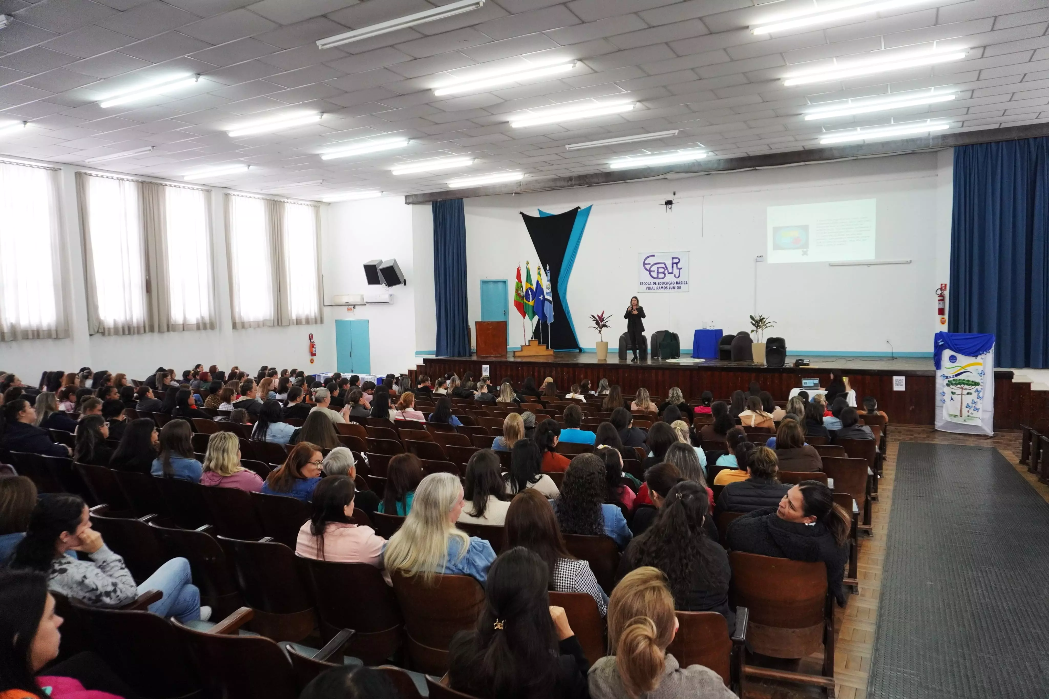 A Secretaria Municipal da Educação realizou, nesta quinta-feira (24 de abril), mais uma edição do Encontro de Formação Continuada e Permanente dos professores da Educação Infantil. Promovido no auditório da Escola de Educação Básica (E.E.B.) Vidal Ramos Júnior, o encontro reuniu cerca de 700 educadores. Com foco na educação inclusiva, o evento contou com a palestra “Professor e Diversidade: Como Superar Desafios com Serenidade”, proferida pela professora e psicopedagoga, Viviane Olivo.